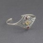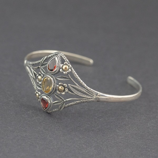 Elegancka bransoletka od podstaw wykonana została ręcznie ze srebra próby 925 oraz złota 18K. Pomiędzy zdobieniami lśnią kamienie granatu (6x4 mm) i cytrynu (8x6 mm). Szerokość bransoletki w najszerszym miejscu 29 mm. Bransoletka będzie pasowała na nadgarstek o obwodzie 16-17 cm. Pojedynczy egzemplarz.