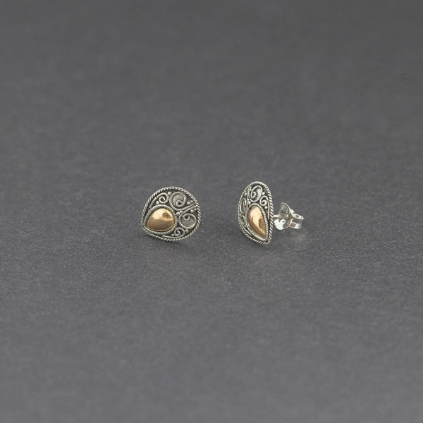 Kolczyki - sztyfty wykonane od postaw ręcznie ze srebra próby 925 oraz 18-karatowego złota. Wielkość kolczyków 10x12 mm. Całość zdobień wykonana została ręcznie pracochłonną techniką granulacji.