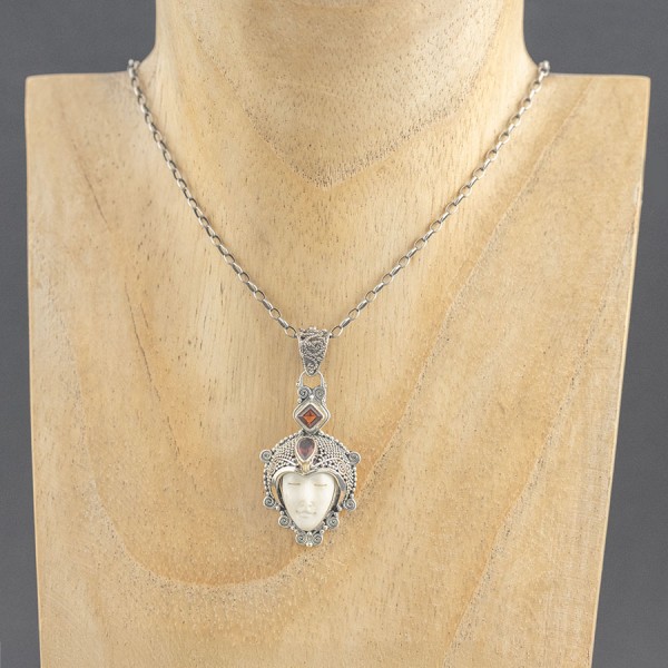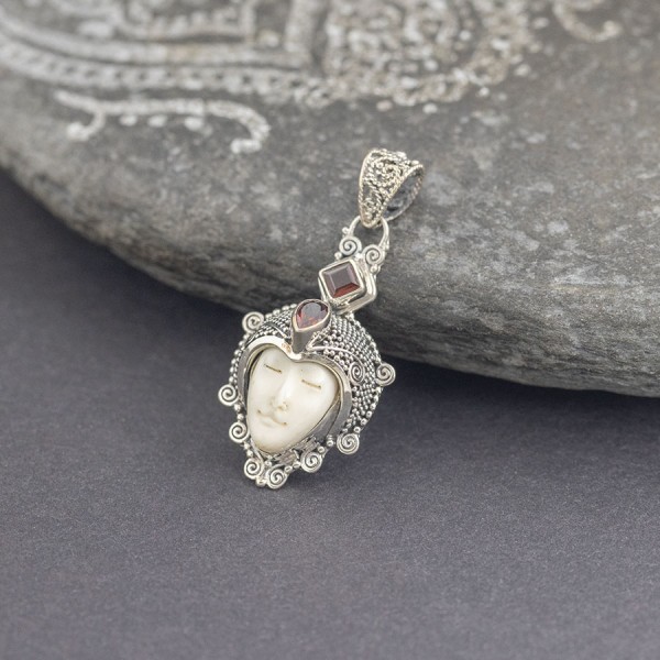 Ręcznie rzeźbiona twarz balijskiej tancerki oprawiona w pięknie zdobione srebro próby 925. Wisior dodatkowo ozdobiony został kamieniami granatu (5 mm i 6x4 mm). Wielkość wisiorka 32x19 mm. Długość wisiorka 4,4 cm.
