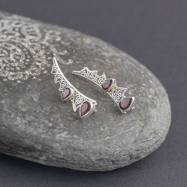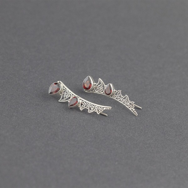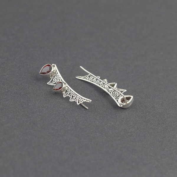 Niezwykle kobiece i delikatne kolczyki wykonane ze srebra próby 925 oraz kamieni granatu. Wielkość kamieni 4x6 mm i 5x7 mm. Długość całkowita kolczyków 3,2 cm.