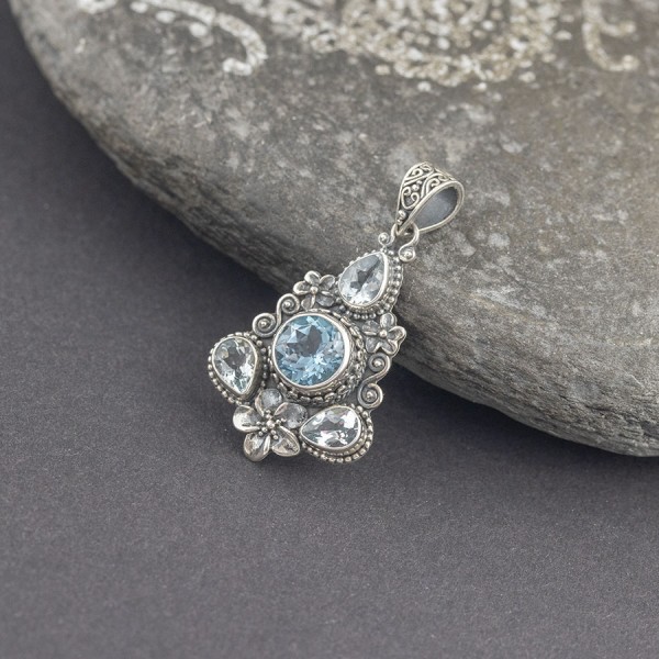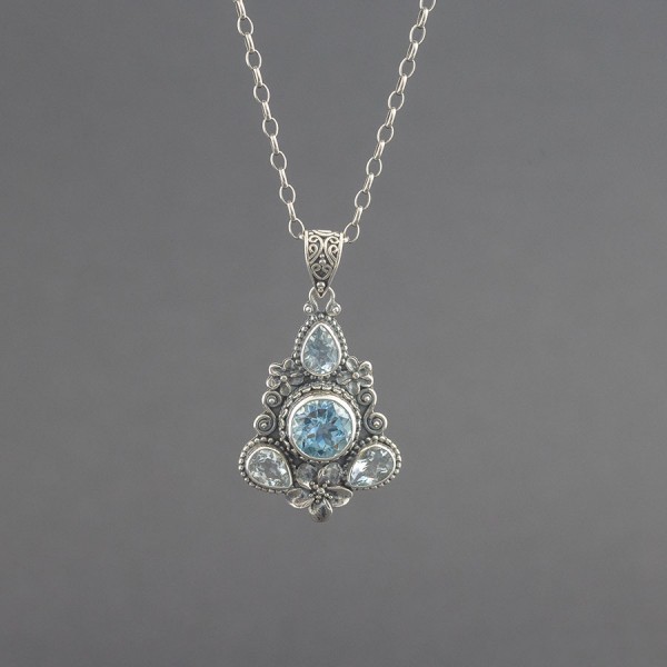 Wisiorek motywem kwiatowym od podstaw wykonany został ręcznie ze srebra próby 925 oraz kamieni błękitnego topazu. Wielkość kamieni 5x7 mm i 9 mm. Wielkość tarczy wisiorka 32x23 mm. Długość całkowita wisiorka 4,3 cm.