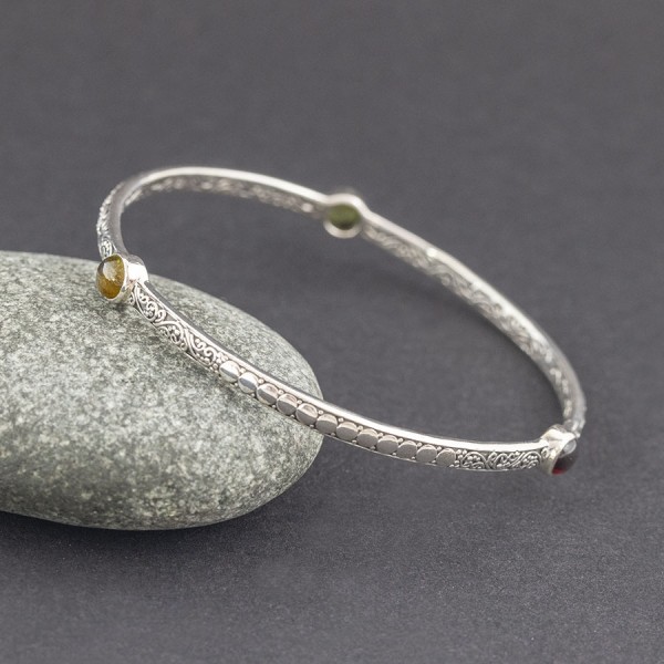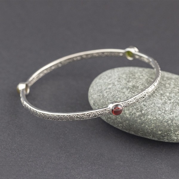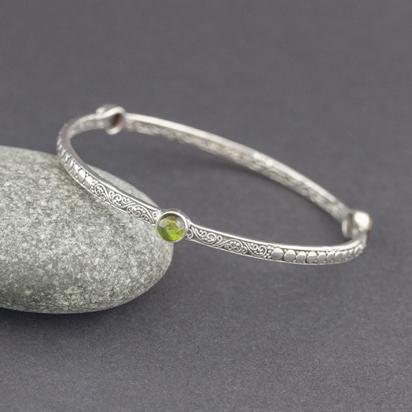 Bransoletka od postaw wykonana ręcznie ze srebra próby 925. Pomiędzy zdobieniami oprawione zostały trzy kamienie turmalinu. Wielkość kamieni 6 mm. Szerokość bransoletki 4 mm. Średnica wewnętrzna 67 mm. Na uwagę zasługują zdobienia wykonane wewnątrz bransoletki. Całość zdobień wykonana została ręcznie pracochłonną techniką granulacji.