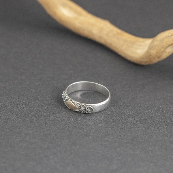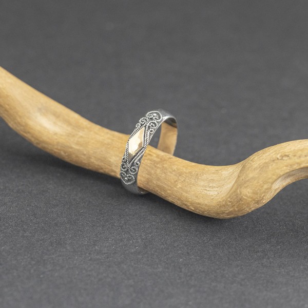 Elegancka obrączka wykonana ręcznie ze srebra próby 925 oraz 18-karatowego złota. Szerokość obrączki 4 mm. Pierścionek występuje w rozmiarze jubilerskim 17.