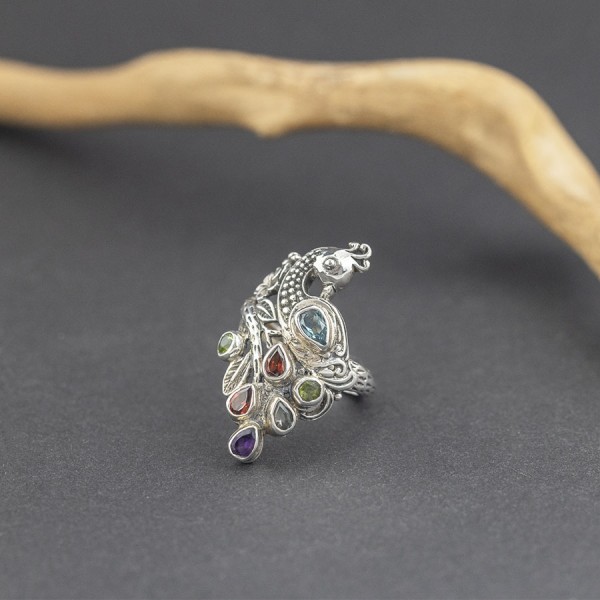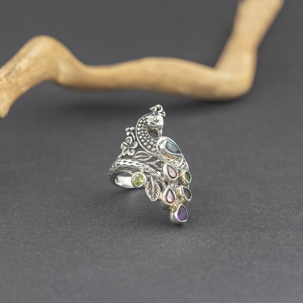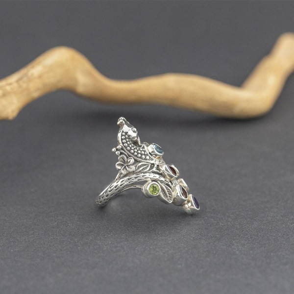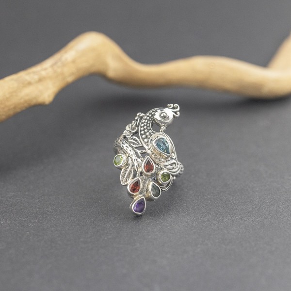 Pierścionek z motywem rajskiego ptaka od podstaw wykonany został ręcznie ze srebra próby 925. Pierścionek zdobią kamienie granatu (3x4 mm), ametystu (3x4 mm), topazu (6x4 mm i 3x4 mm), peridotu (3 mm). Rozmiar jubilerski 17. Pojedynczy egzemplarz!