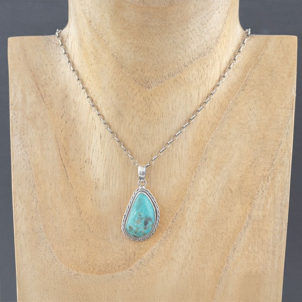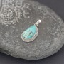 Wisiorek wykonany ze srebra próby 925 z oprawionym kamieniem turkusu. Wielkość kamienia 11x20 mm. Wielkość tarczy wisiorka 15x23 mm. Całość zdobień wykonana została ręcznie. Długość całkowita wisiorka 3,4 cm.