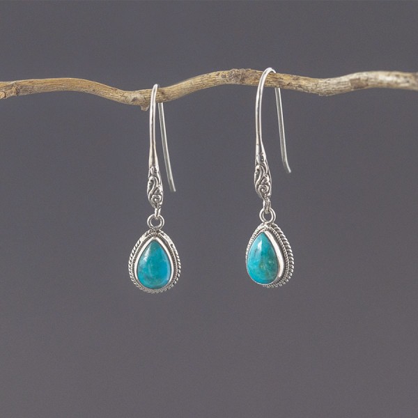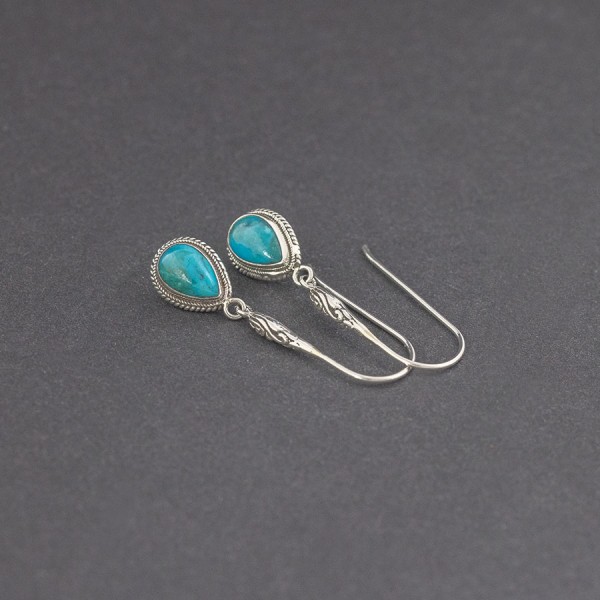 Kolczyki, których podstawę stanowią kamienie turkusu (6x8 mm) oprawione w srebro próby 925. Kolczyki ozdobione są ręcznie wykonanym ornamentem. Wielkość tarczy kolczyka 9x11 mm. Długość całkowita kolczyków 3,7 cm.
