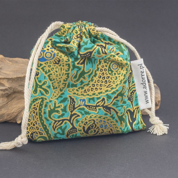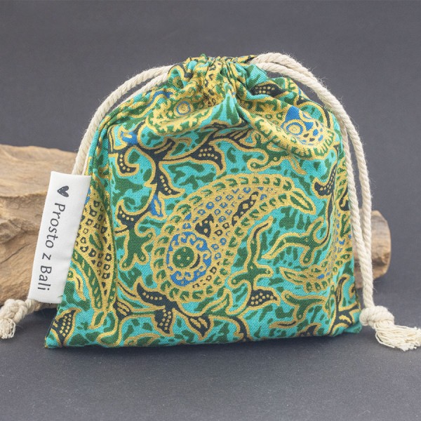 Woreczek w kolorze SZMARAGD, wykonany ręcznie z tkaniny o tradycyjnym balijskim wzornictwie. Stanowi oryginalny dodatek do biżuterii i podkreśla jej unikalny charakter.