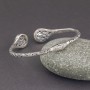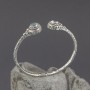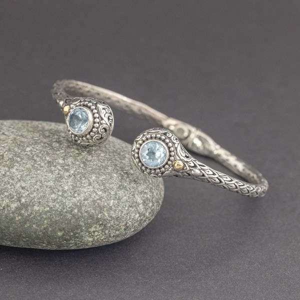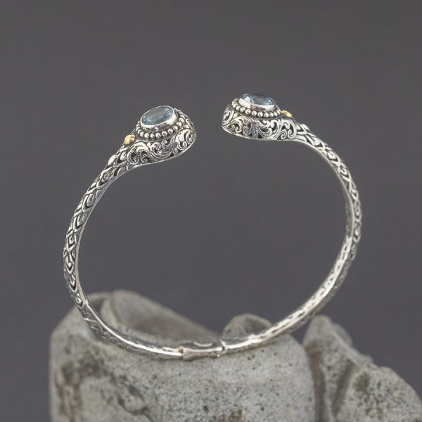 Niezwykła bransoletka od podstaw wykonana ręcznie ze srebra próby 925 oraz złota 18K. Początek i koniec bransoletki ozdabiają kamienie topazu. Wielkość kamieni 7 mm. Szerokość bransoletki 4 mm. Element ozdobny umieszczony w centralnej części bransoletki stanowi jednocześnie mechanizm ułatwiający zakładanie i zdejmowanie bransoletki. Bransoletka będzie odpowiednia na nadgarstek o obwodzie 17-17,5 cm.