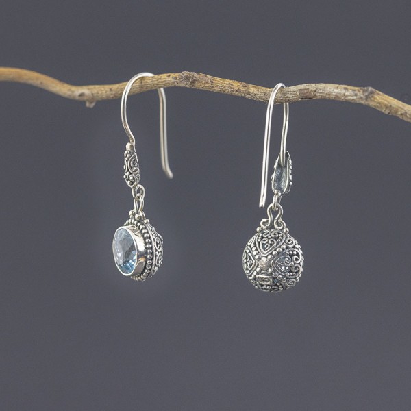 Eleganckie kolczyki, których podstawę stanowią kamienie niezwykłej błękitnego topazu (8 mm) oprawione w srebro próby 925. Kolczyki ozdobione są ręcznie wykonanym ornamentem. Bigle również zostały wykonane i ozdobione ręcznie. Na uwagę zasługuje ażurowe zdobienie z tyłu kolczyka. Wielkość tarczy kolczyka 10 mm. Długość całkowita kolczyków 3,6 cm.