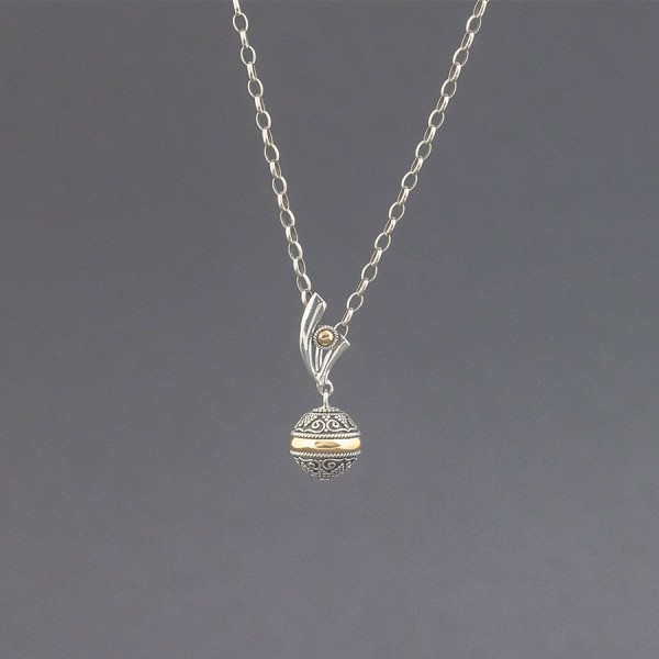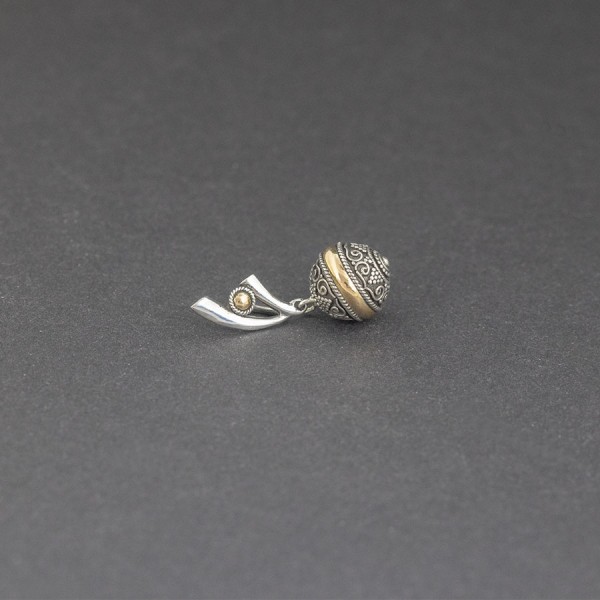 Elegancki wisiorek od podstaw wykonany ręcznie ze srebra próby 925 oraz 18-karatowego złota. Wielkość ażurowej kuleczki 11 mm. Długość wisiorka 2,3 cm.