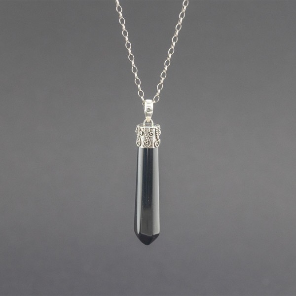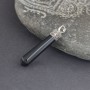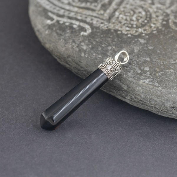 Kamień onyksu ubrany w srebro próby 925. Całość zdobień wykonana ręcznie. Wielkość wisiorka 50x10 mm. Długość całkowita wisiorka 5,9 cm.