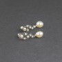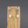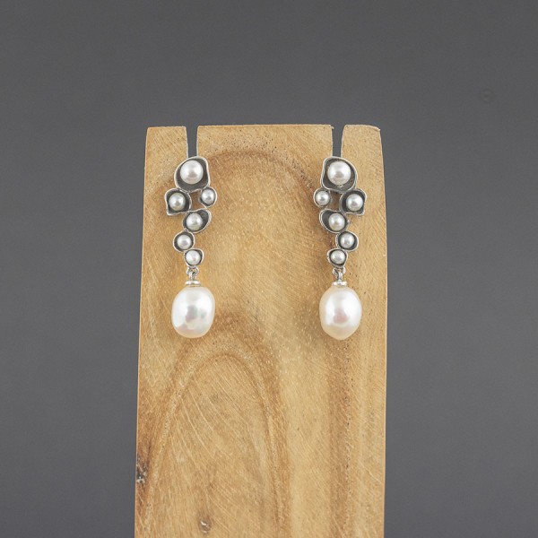 Wyjątkowe kolczyki od podstaw wykonane ręcznie ze srebra próby 925 oraz pereł słodkowodnych. Długość całkowita kolczyków 3,7 cm. Wielkość wiszących pereł 10x9 mm. Wielkość elementu z oprawionymi perełkami 10x21 mm.
