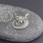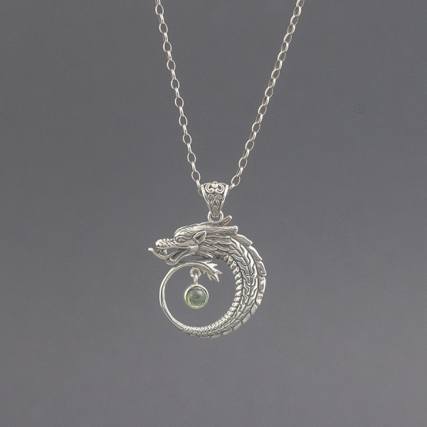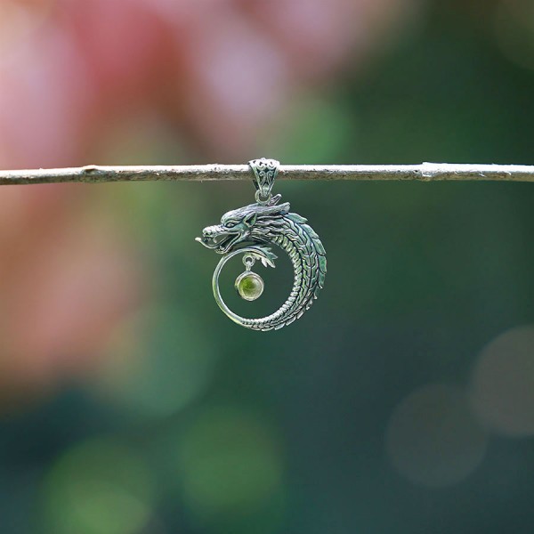 Niezwykłej urody kamień zielonego turmalinu strzeżony przez smoka. Całość wykonana ręcznie ze srebra próby 925. Wielkość kamienia 5,5 mm. Wielkość tarczy wisiora 32x30 mm. Długość całkowita wisiora 4,1 cm.