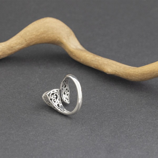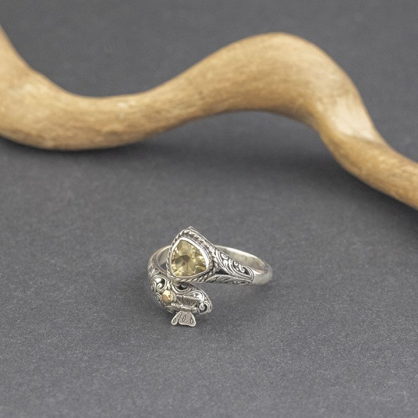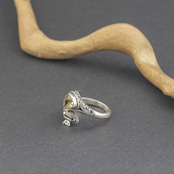 Pierścionek od podstaw wykonany ręcznie ze srebra próby 925 oraz 18-karatowego złota z oprawionymi kamieniami cytrynu. Wielkość kamienia 7 mm. Pierścionek jest regulowany i będzie pasował na palec w rozmiarze jubilerski 19-20. Na uwagę zasługuje ozdobny tył pierścionka. Pojedynczy egzemplarz!