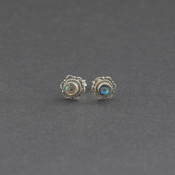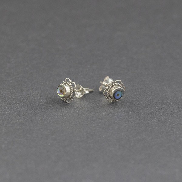 Kolczyki - sztyfty od podstaw wykonane ręcznie ze srebra próby 925 z oprawioną muszlą paua (4 mm). Wielkość kolczyków 8 mm.