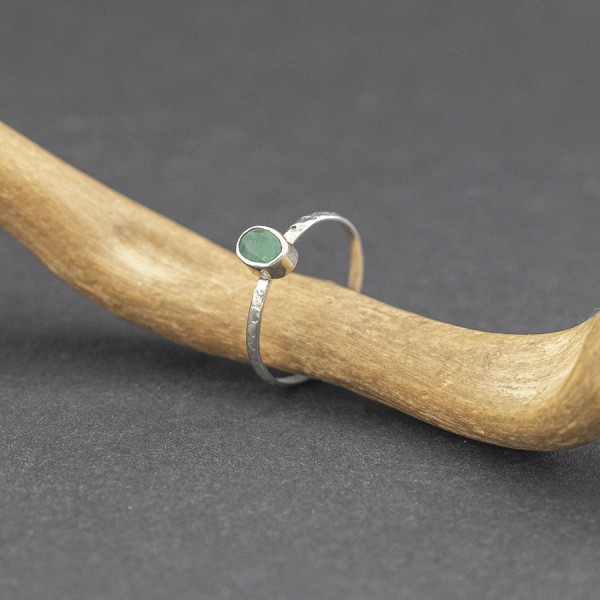 Delikatny pierścionek od podstaw wykonany ręcznie ze srebra próby 925 z oprawionym kamieniem szmaragdu. Wielkość kamienia 4x5 mm. Szerokość obrączki 1,5 mm. Rozmiar jubilerski 14. Pierścionek stworzony z myślą o Paniach lubiących drobną biżuterię.