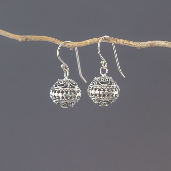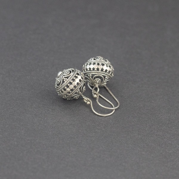 Kolczyki od podstaw wykonane ręcznie ze srebra próby 925. Wielkość ażurowych kuleczek 15 mm. Długość całkowita kolczyków 3,3 cm.