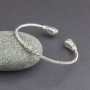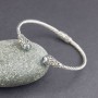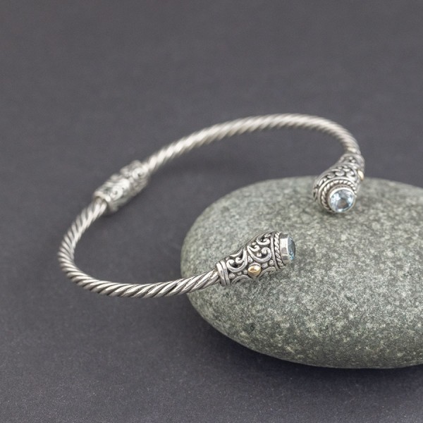 Niezwykła bransoletka od podstaw wykonana ręcznie ze srebra próby 925 oraz złota 18K. Początek i koniec bransoletki ozdabiają kamienie błękitnego topazu. Wielkość kamieni 5 mm. Szerokość bransoletki 3 mm. Element ozdobny umieszczony w centralnej części bransoletki stanowi jednocześnie mechanizm ułatwiający zakładanie i zdejmowanie bransoletki. Bransoletka będzie odpowiednia na nadgarstek o obwodzie 17,5-18,5 cm.