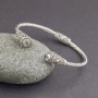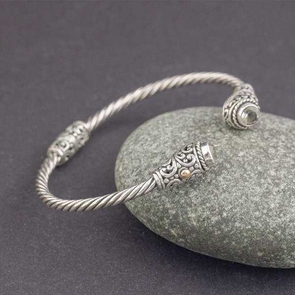 Niezwykła bransoletka od podstaw wykonana ręcznie ze srebra próby 925 oraz złota 18K. Początek i koniec bransoletki ozdabiają kamienie zielonego ametystu. Wielkość kamieni 5 mm. Szerokość bransoletki 3 mm. Element ozdobny umieszczony w centralnej części bransoletki stanowi jednocześnie mechanizm ułatwiający zakładanie i zdejmowanie bransoletki. Bransoletka będzie odpowiednia na nadgarstek o obwodzie 15,5-16,5 cm.