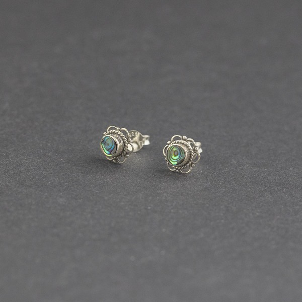 Kolczyki - sztyfty od podstaw wykonane ręcznie ze srebra próby 925 z oprawioną muszlą paua (4 mm). Wielkość kolczyków 8 mm.