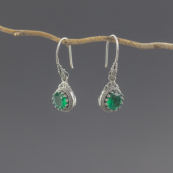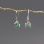 Eleganckie kolczyki, których podstawę stanowią kamienie kwarcu zielonego (9 mm) oprawione w srebro próby 925. Kolczyki ozdobione są ręcznie wykonanym ornamentem. Bigle również zostały wykonane i ozdobione ręcznie. Na uwagę zasługuje ażurowe zdobienie z tyłu kolczyka. Wielkość tarczy kolczyka 12 mm. Długość całkowita kolczyków 3,5 cm.