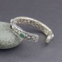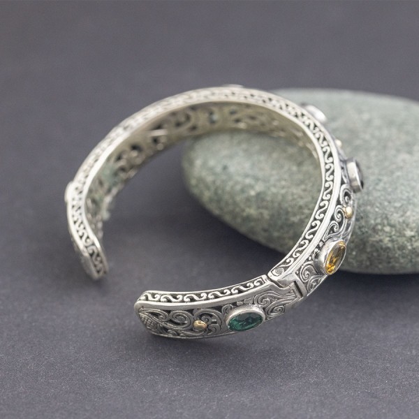 Absolutnie niezwykła bransoletka od podstaw wykonana została ręcznie ze srebra próby 925 oraz złota 18K. Pomiędzy zdobieniami lśnią kamienie topazu, kwarcu zielonego, cytrynu i granatu (4 mm) i złote akcenty. Ażurowe zdobienia bransoletka otrzymała również wewnątrz. Szerokość bransoletki 11 mm. Z boku bransoletka posiada mechanizm ułatwiający jej zakładanie i zdejmowanie. Bransoletka będzie pasowała na szczupły nadgarstek o obwodzie 15,5-16 cm. Wykonana z niebywałą precyzją i kunsztem - polecam!