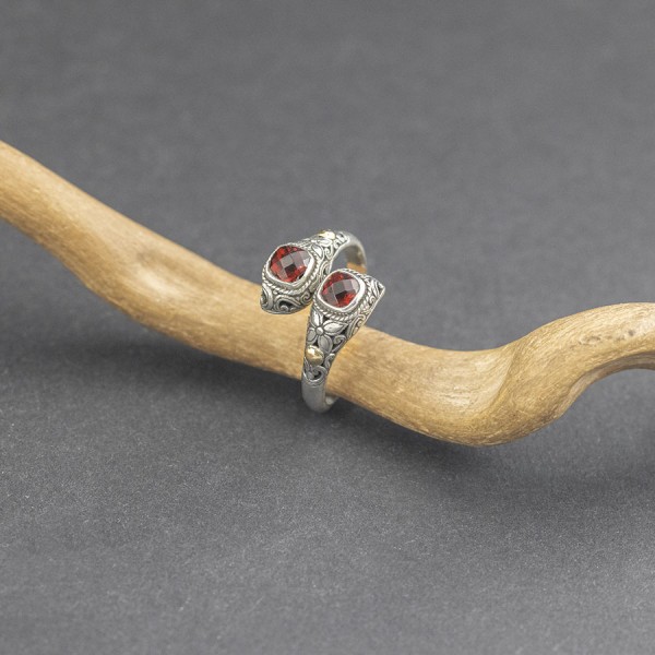 Pierścionek od podstaw wykonany ręcznie ze srebra próby 925 oraz 18-karatowego złota z oprawionymi kamieniami granatu. Wielkość kamienia 5 mm. Pierścionek będzie pasował na palec w rozmiarze jubilerskim 23 (pierścionek jest regulowany więc można go dopasować do palca) . Na uwagę zasługuje ozdobny tył pierścionka. Pojedynczy egzemplarz!