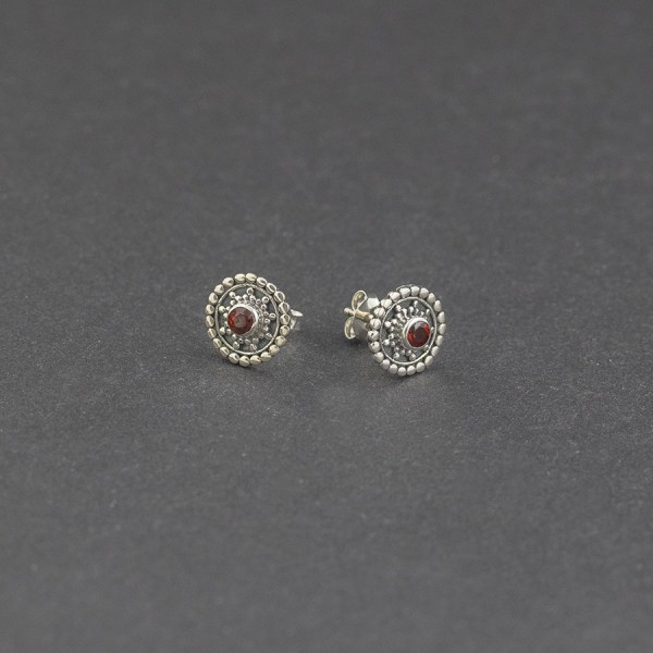 Kolczyki - sztyfty od podstaw wykonane ręcznie ze srebra próby 925 oraz kamieni granatu. Całość zdobień wykonana została ręcznie, pracochłonną techniką granulacji. Wielkość kamieni 3 mm. Wielkość kolczyków 10 mm.