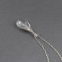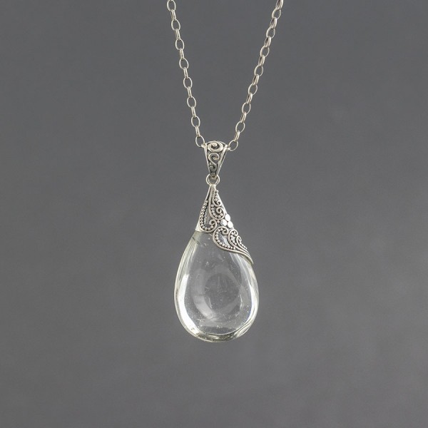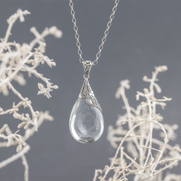 Kryształowa łza ubrana w srebro próby 925. Całość zdobień wykonana została ręcznie pracochłonną techniką granulacji. Wielkość kryształu górskiego 38x21 mm. Długość całkowita wisiorka 4,9 cm.