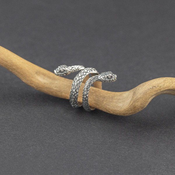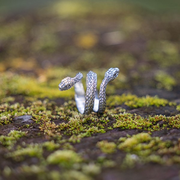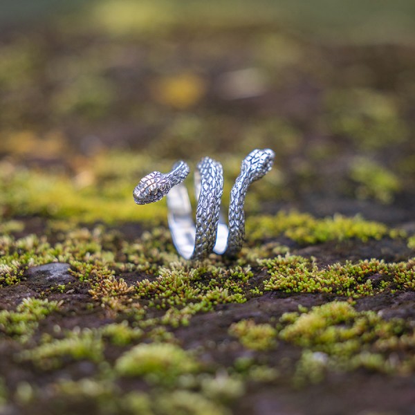 Pierścionek z motywem węża od podstaw wykonany został ręcznie se srebra próby 925. Rozmiar jubilerski 16. Pojedynczy egzemplarz!
