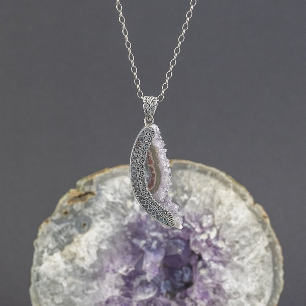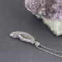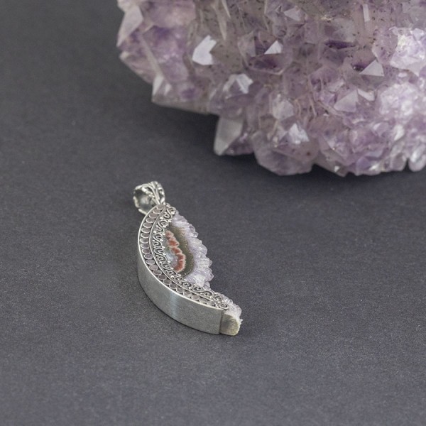 Kamień ametystu ubrany w srebro próby 925. Całość zdobień wykonana ręcznie. Wielkość wisiorka 43x16 mm. Długość całkowita wisiorka 5,4 cm.