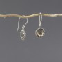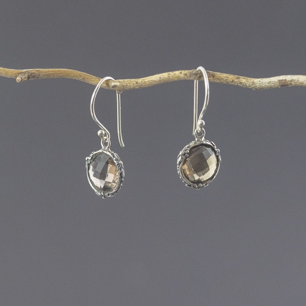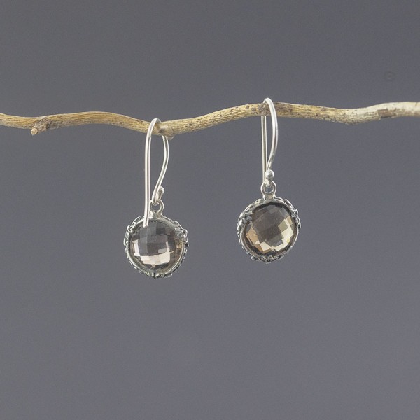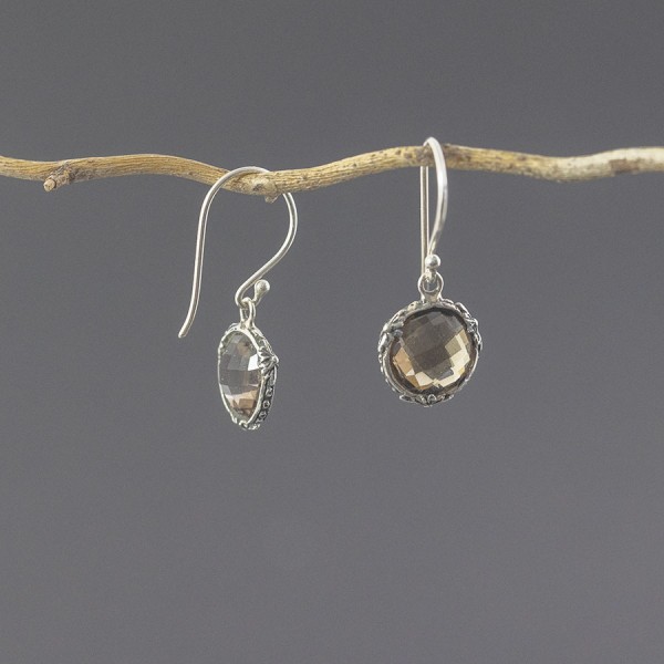 Kolczyki od podstaw wykonane zostały ręcznie ze srebra próby 925 z oprawionymi kamieniami kwarcu dymnego. Wielkość kamienia 10 mm. Długość całkowita kolczyków 3,1 cm.