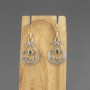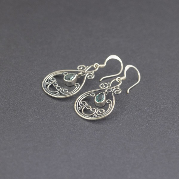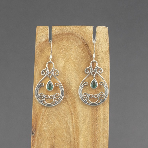 Ażurowe kolczyki od podstaw wykonane zostały ręcznie ze srebra próby 925 z oprawionymi kamieniami kwarcu zielonego. Wielkość kamieni 6x4 mm. Wielkość ażurowej tarczy kolczyka 19x29 mm. Długość całkowita kolczyków 4,4 cm.