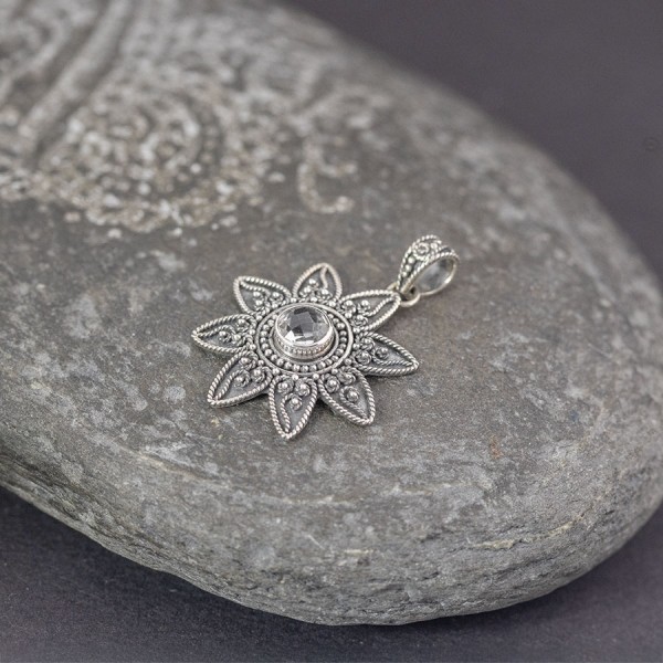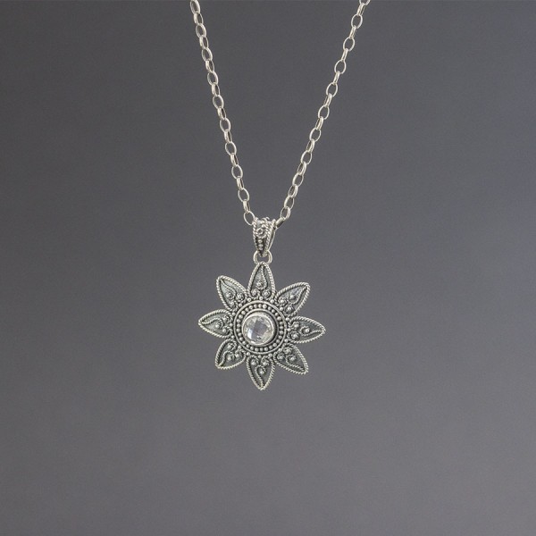 Wisiorek z oprawionym w srebro kamieniem kryształu (6 mm) od podstaw wykonany ręcznie pracochłonną techniką granulacji. Wielkość tarczy wisiorka 25x25 mm. Długość całkowita wisiorka 3,4 cm.