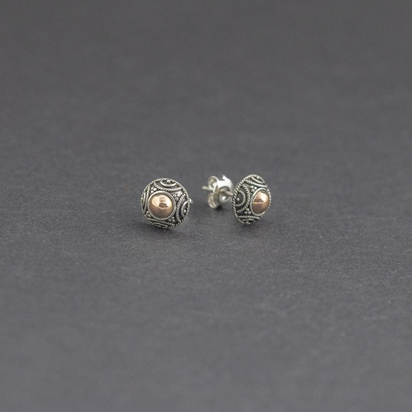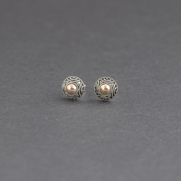 Kolczyki - sztyfty wykonane od postaw ręcznie ze srebra próby 925 oraz 18-karatowego złota. Wielkość kolczyków 9 mm. Całość zdobień wykonana została ręcznie pracochłonną techniką granulacji.