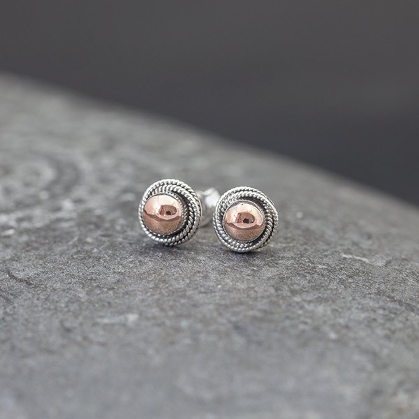 Kolczyki - sztyfty wykonane od postaw ręcznie ze srebra próby 925 oraz 18-karatowego złota. Wielkość kolczyków 7,5 mm.