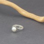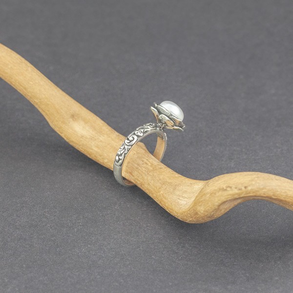 Elegancki pierścionek wykonany ze srebra próby 925 z oprawioną białą perłą (8 mm). Pierścionek ozdobiony został ręcznie wykonanym ornamentem. Wielkość tarczy pierścionka 12 mm. Szerokość obrączki 3 mm. Rozmiar jubilerski 14.
