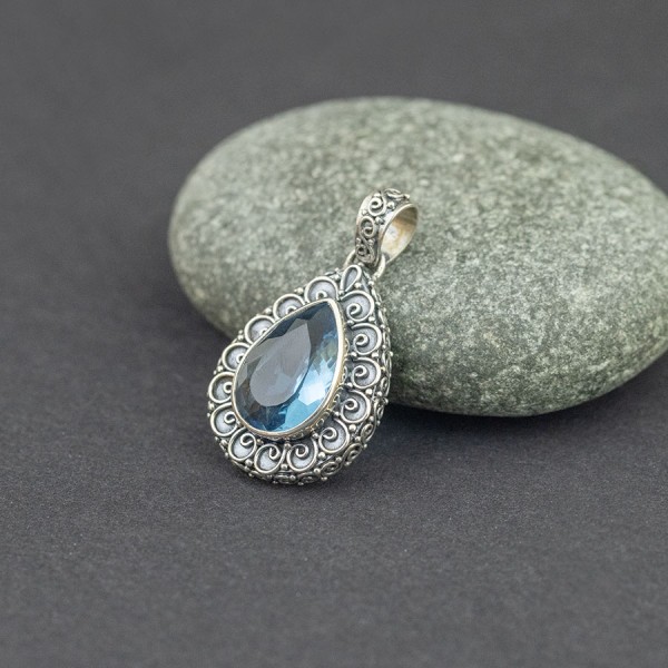 Wisiorek z oprawionym w srebro kamieniem topazu (12x18 mm) od podstaw wykonany ręcznie. Bok wisiorka ozdobiony został ręcznie wykonanym ornamentem. Wielkość tarczy wisiorka 22x29 mm. Długość całkowita wisiorka 3,9 cm.