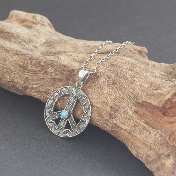 Wisiorek z motywem "pacyfki" - symbolu pokoju, od podstaw wykonany został ręcznie ze srebra próby 925 z oprawionym kamieniem turkusu. Wielkość kamienia 4 mm. Wielkość tarczy wisiorka 28 mm. Długość całkowita wisiorka 3,9 cm.