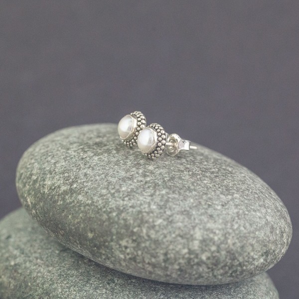 Kolczyki - sztyfty od podstaw wykonane ręcznie ze srebra próby 925 z oprawionym perłami słodkowodnymi. Całość zdobień wykonana została ręcznie, pracochłonną techniką granulacji. Wielkość pereł 5 mm. Wielkość kolczyków 8 mm.