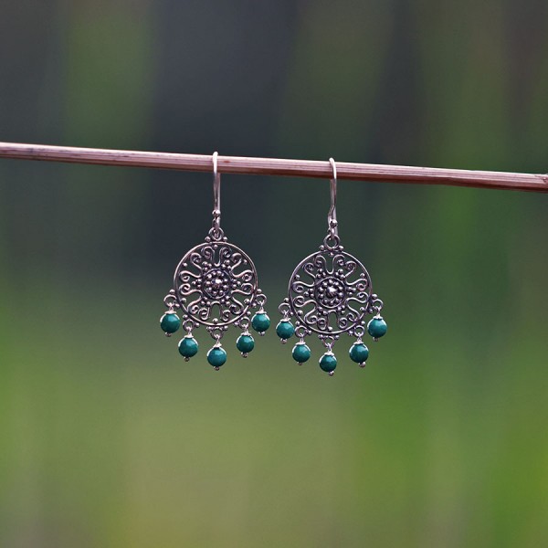 Kolczyki w orientalnym stylu od podstaw wykonane zostały ręcznie ze srebra próby 925 oraz kamieni malachitu. Wielkość. Kamieni 4 mm. Wielkość ozdobnej tarczy kolczyka 18 mm. Długość całkowita kolczyków 4,7 cm.