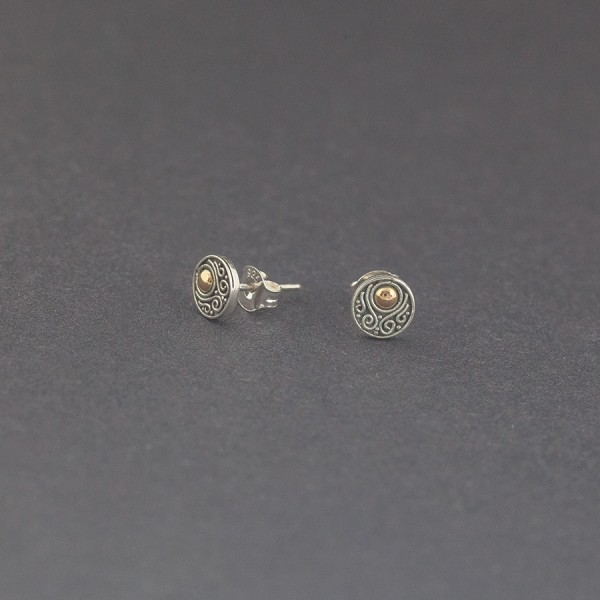 Kolczyki - sztyfty wykonane od postaw ręcznie ze srebra próby 925 oraz 18-karatowego złota. Wielkość kolczyków 7 mm.