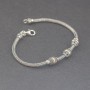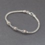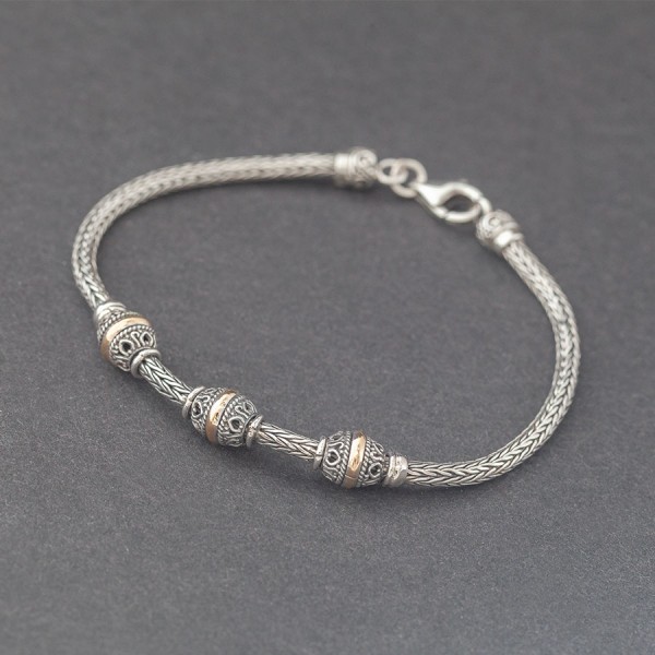 Elegancka bransoletka wykonana ze srebra próby 925 oraz 18-karatowego złota. Wielkość koralików bali 7x8 mm. Łańcuszek został upleciony ręcznie. Grubość łańcuszka 2,8 mm. Całość zdobień wykonana została ręcznie. Długość całkowita bransoletki 18,7 cm.