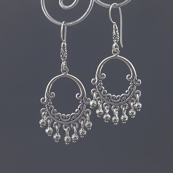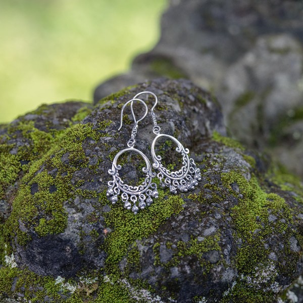 Wyjątkowe kolczyki od podstaw wykonane ręcznie ze srebra próby 925. Każda kuleczka została wykonana również ręcznie. Wielkość ozdobnej tarczy kolczyka 21x18 mm. Długość całkowita kolczyków 5,5 cm.