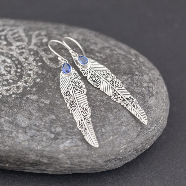 Wyjątkowe kolczyki od podstaw wykonane ręcznie ze srebra próby 925 oraz kyanitu. Wielkość kamieni 6x4 mm. Wielkość pióra 45x10,5 mm. Długość całkowita kolczyków 6,4 cm.