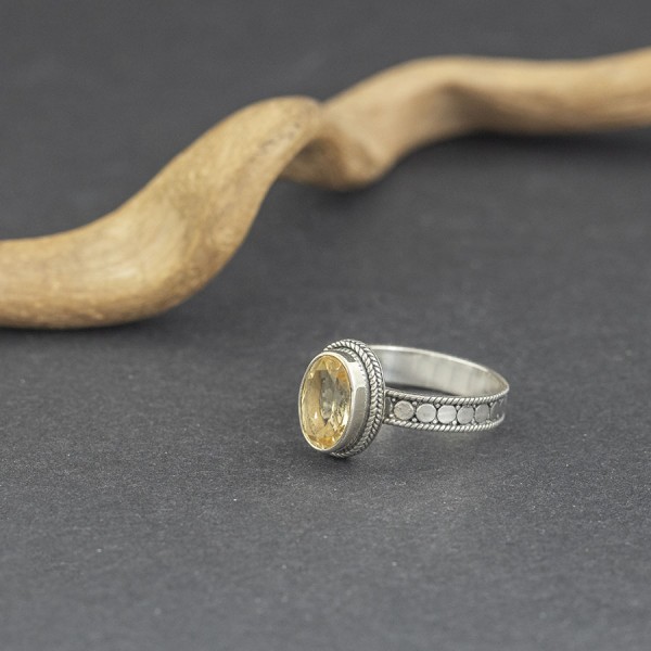 Elegancki pierścionek wykonany ze srebra próby 925 z oprawionym kamieniem cytrynu (7x11 mm). Kamień ozdobiony został ręcznie wykonanym ornamentem. Wielkość tarczy pierścionka 13x10 mm. Szerokość obrączki 4 mm. Pierścionek występuje w rozmiarze jubilerskim 17.
