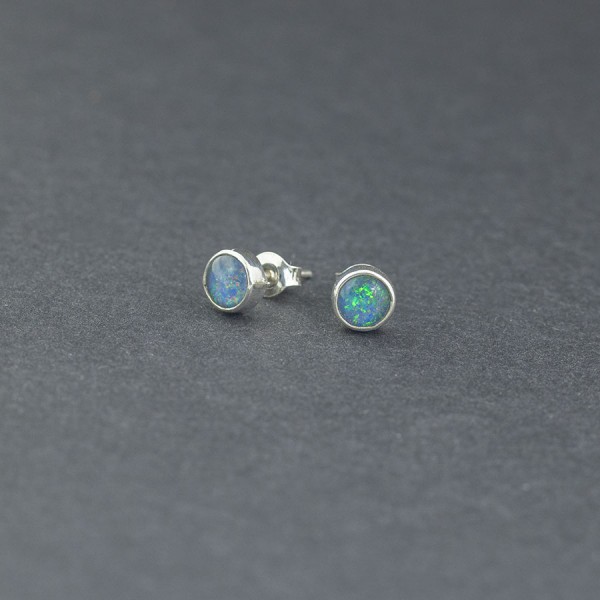 Kolczyki - sztyfty wykonane ze srebra próby 925 z oprawionymi kamieniami opalu australijskiego (typu triplet). Wielkość kamienia 6 mm. Wielkość kolczyków 7 mm.