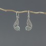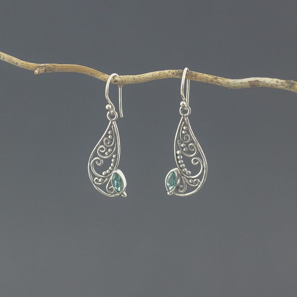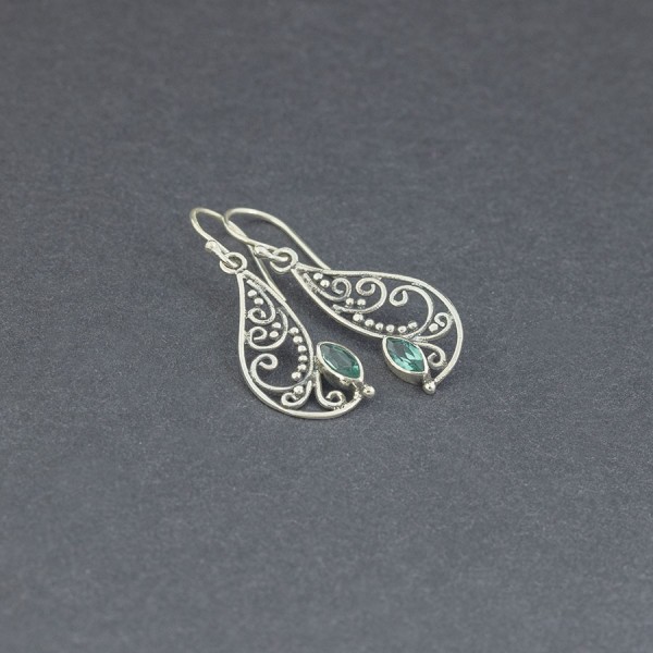 Kolczyki od podstaw wykonane ręcznie ze srebra próby 925 oraz kwarcu zielonego. Wielkość kamieni 3,6 mm. Wielkość tarczy kolczyka 23x11 mm. Długość całkowita kolczyków 3,7 cm.