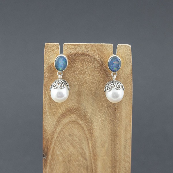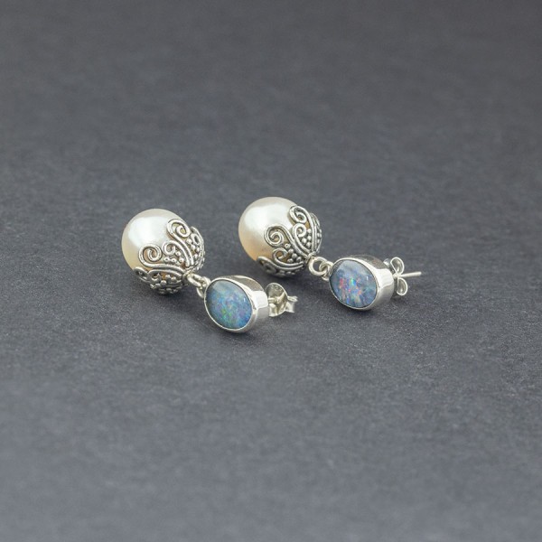 Eleganckie kolczyki od podstaw wykonane zostały ręcznie ze srebra próby 925. Białe perły słodkowodne (10x112 mm) otrzymały ręcznie zdobione czapeczki a sztyft ozdabia kamień opalu triplet (9x7 mm). Długość całkowita kolczyków 2,7 cm.