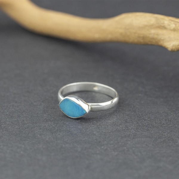 Pierścionek od podstaw wykonany ręcznie ze srebra próby 925 z oprawionym kamieniem opalu australijskiego (typu dublet). Wielkość kamienia 7x11 mm. Rozmiar jubilerski 22.